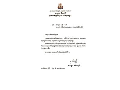 ខាងក្រោមនេះគឺជា សារលិខិតថ្លែងអំណរគុណរបស់ ព្រះករុណាព្រះបាទសម្តេចព្រះបរមនាថ នរោតម្ត សីហមុនី ព្រះមហាក្សត្រនៃព្រះរាជាណាចក្រកម្ពុជា ជូនចំពោះ ឯកឧត្តមទេសរដ្ឋមន្ត្រី អៀង មូលី ប្រធានអាជ្ញាធរជាតិប្រយុទ្ធនឹងជំងឺអេដស