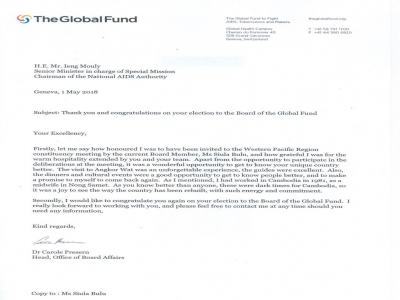 ...អានបន្ថែម »ក្នុងនាមលេខាធិការដ្ឋានរបស់មូលនិធិសកល ខ្ញុំសូមថ្លែងអំណរគុណយ៉ាងជ្រាលជ្រៅ ជូនឯកឧត្តមទេសរដ្ឋមន្រ្តី ដែលបានលះបង់ចំណាយពេលវេលា សំរាប់ប្រយុទ្ធប្រឆាំងនឹងជំងឺអេដស៍ របេង និងគ្រុនចាញ់ និងជាពិសេសយើងខ្ញុំ សូមថ្លែងអំណរគុណ និង ការកោតសសើរ ចំពោះការដឹកនាំសម្របសម្រួលគួរអោយចាប់អារម្មណ៍ របស់