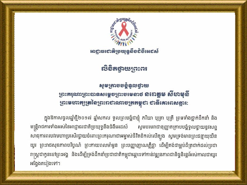 លិខិតថ្វាយព្រះពរ ព្រះករុណាព្រះបាទសម្តេចព្រះបរមនាថ នរោត្តម សហីមុនី ព្រះមហាក្សត្រនៃព្រះរាជាណាចក្រកម្ពុជា ទីជាគោរពសក្កាៈ ក្នុងឳកាសចូលឆ្នាំថ្មី ឆ្នាំសកល ២០១៧ ក្រាបបង្គំទូលថ្វាយពី ឯកឧត្តមទេសរដ្ឋមន្រ្តី អៀង មូលី ប្រធានអាជ្ញាធរជាតិប្រយុទ្ធនឹងជំងឺអេដស៍