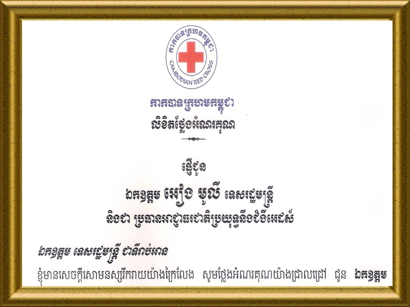 លិខិតថ្លែងអំណរគុណសមេ្តចកិត្តិព្រឹទ្ធបណ្ឌិត ប៊ុន រ៉ានី ហ៊ុនសែន ប្រធានកាកបាទក្រហមកម្ពុជា ផ្ងើជូន ឯកឧត្តម អៀង មូលី ទេសរដ្ឋមន្រ្តី និងជា ប្រធានអាជ្ញាធរជាតិប្រយុទ្ធនឹងជំងឺអេដស៍