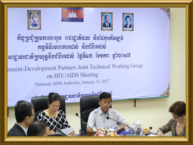 នារសៀលថ្ងៃទី១៣ ខែមករា ឆ្នាំ២០១៧ នៅទីស្នាក់ការអាជ្ញាធរជាតិប្រយុទ្ធនឹងជំងឺអេដស៍ ឯកឧត្តមទេសរដ្ឋមន្រ្តី អៀង មូលី ប្រធានអាជ្ញាធរជាតិប្រយុទ្ធនឹងជំងឺអេដស៍ បានដឹកនាំកិច្ចប្រជុំក្រុមការងាររួមរវាងរាជរដ្ឋាភិបាល និងដៃគូរអភិវឌ្ឍន៍លើការងារប្រយុទ្ធនឹងជំងឺអេដស៍ ដោយមានការចូលរួមពីសំណាក់ ឯកឧត្តម លោកជំទាវ លោក លោកស្រី ជាតំណាងស្ថាប័ន ក្រសួងពាក់ព័ន្ធ តំណាងទីភ្នាក់ងារដៃគូអភិវឌ្ឍ ម្ចាស់ជំនួយ តំណាងអង្គការមិនមែនរដ្ឋាភិបាល អង្គការសង្គមស៊ីវិល អង្គការសហប្រជាជាតិនានា។ល។ កិច្ចប្រជុំក្រុមការងាររួមរវាងរាជរដ្ឋាភិបាល និងដៃគូរអភិវឌ្ឍន៍លើការងារប្រយុទ្ធនឹងជំងឺអេដស៍ បានផ្តោតលើការវិវត្តន៍សូចនាកររួមរវាងរដ្ឋាភិបាល និងដៃគូអភិវឌ្ឍន៍ឆ្នាំកន្លងទៅ(JMI2015-2016) និងពិនិត្យមើលសូចនាករឆ្នាំ ២០១៧-២០១៨ របស់ CRDB/CDC ដោយផ្តោតលើការសម្រេចចិត្តរបស់រដ្ឋាភិបាល ក្នុងការបញ្ចប់ការរីករាលដាលមេរោគអេដស៍នៅឆ្នាំ២០២៥នៅក្នុងបរិបទមួយដែលដៃគូអភិវឌ្ឍន៍កំពុងកាត់បន្ថយជំនួយនិងការបង្កើនថវិកាជាតិដើម្បីរួមចំណែកពង្រឹងភាពជាម្ចាស់ក្នុងការឆ្លើយតបដើម្បីឲ្យមានប្រសិទ្ធភាពនិងប្រសិទ្ធផល ក្នុងការត្រៀមខ្លួនធានាការឆ្លើយតបប្រកបដោយចេរភាព។