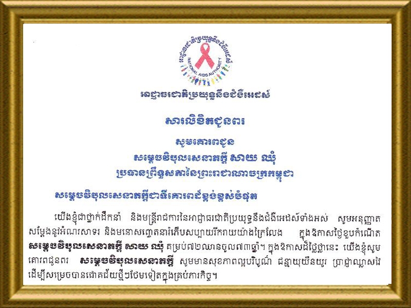 សារលិខិត ឯកឧត្តមទេសរដ្ឋមន្រ្តី អៀង មូលី ប្រធានអាជ្ញាធរជាតិប្រយុទ្ធនឹងជំងឺអេដស៍ ផ្ងើជូន សមេ្តចវិបុលសេនាភក្តី សាយ ឈុំ ប្រធានព្រឹទ្ធសភានៃព្រះរាជាណាចក្រកម្ពុជា ក្នុងឳកាសខួបកំណើតគម្រប់ ៧២ ឈានចូល ៧៣ ឆ្នាំ ។