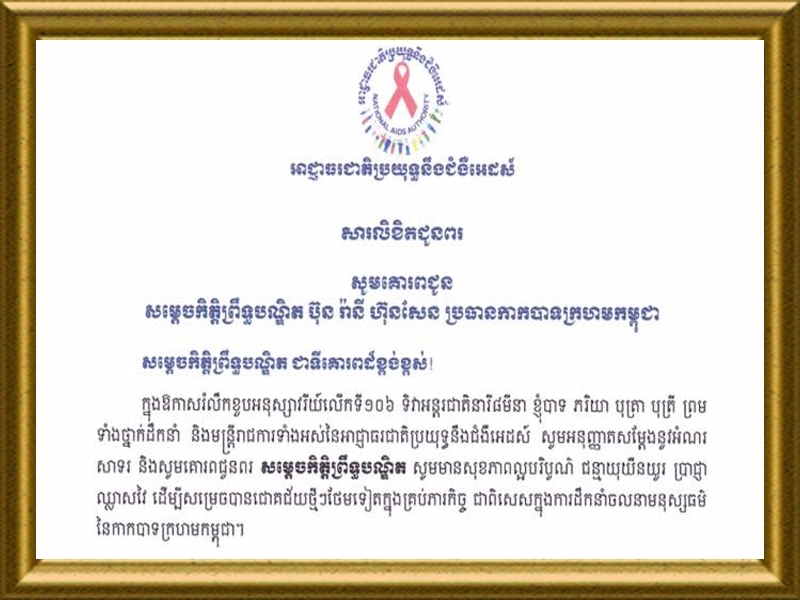 សារលិខិតជូនពរ សម្តេច កិត្តិព្រិទ្ធបណ្ខិត ប៊ុន រ៉ានី ហ៊ុន សែន ប្រធានកាកបាទក្រហមកម្ពុជា ក្នុងឳកាសរំលឺកខួបអនុស្សាវរីយ៍ ទិវាអន្តរជាតិនារី ៨ មិនា ឆ្នាំ ២០១៧