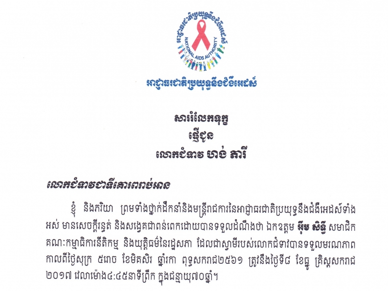 ឯកឧត្តមទេសរដ្ឋមន្ត្រី អៀង មូលី ប្រធានអាជ្ញាធរជាតិប្រយុទ្ធនឹងជំងឺអេដស៍ ផ្ញើសារលិខិតរំលែកទុក្ខជូនលោកជំទាវ ហង់ ភារី ភរិយានៃសព្វ ឯកឧត្តម អ៊ឹម សិទ្ធី