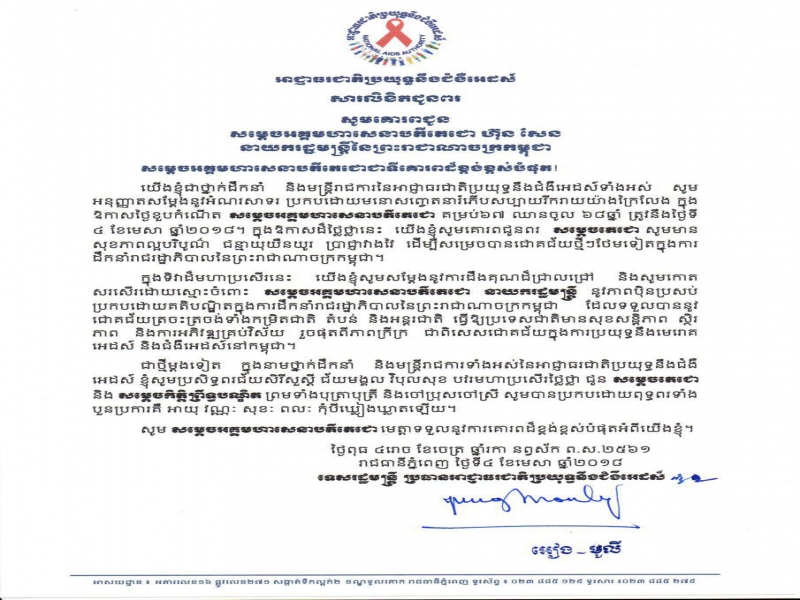 សារលិខិតជូនពរ សម្តេចអគ្គមហាសេនាបតីជោ ហ៊ុន សែន នាយករដ្ឋមន្រ្តីនៃព្រះរាជាណាចក្រកម្ពុជា