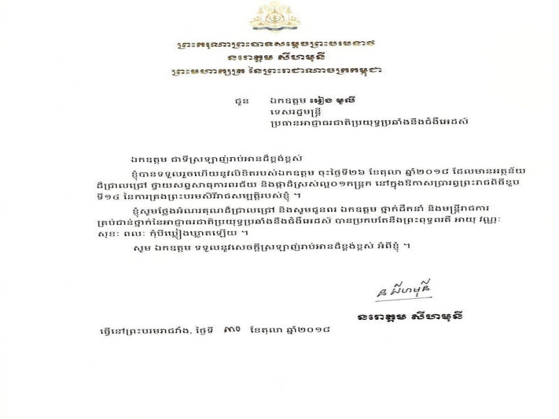 លិខិតព្រះករុណាព្រះបាទសម្តេចព្រះបរមនាថ នរោត្តម សីហមុនី ព្រះមហាក្សត្រនៃព្រះរាជាណាចក្រកម្ពុជា ជូន ឯកឧត្តម អៀង មូលី ទេសរដ្ឋមន្ត្រី ប្រធានអាជ្ញាធរជាតិប្រយុទ្ធនឹងជំងឺអេដស៍