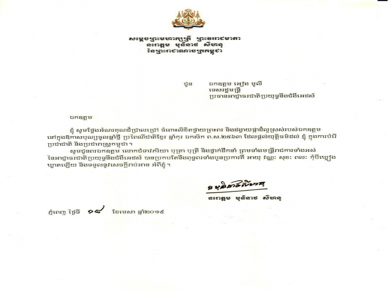 លិខិតថ្លែងអំណរគុណសម្តេចព្រះមហាក្សត្រី ព្រះវររាជមាតា នរោត្តម មុនិនាថ សីហនុ នៃព្រះរាជាណាចក្រកម្ពុជា ជូនចំពោះឯកឧត្តម អៀង មូលី ទេសរដ្ឋមន្ត្រីប្រធានអាជ្ញាធរជាតិប្រយុទ្ធនឹងជំងឺអេដស៍