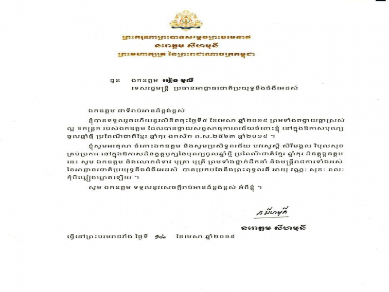 លិខិតថ្លែងអំណរគុណព្រះករុណាព្រះបាទសម្តេចព្រះបរមនាថ នរោត្តម សីហមុនី ព្រះមហាក្សត្រ នៃព្រះរាជាណាចក្រកម្ពុជា ជូនចំពោះឯកឧត្តម អៀង មូលី ទេសរដ្ឋមន្ត្រីប្រធានអាជ្ញាធរជាតិប្រយុទ្ធនឹងជំងឺអេដស៍