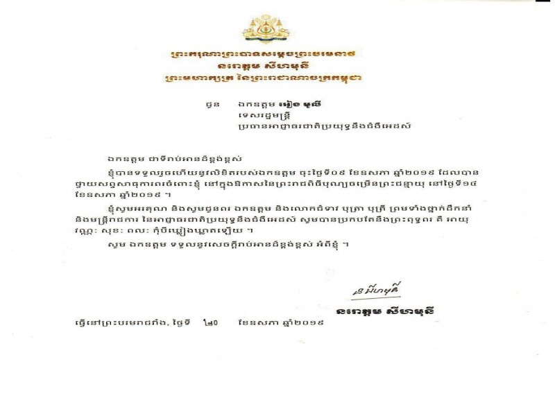 ព្រះរាជសារព្រះករុណាព្រះបាទព្រះបុរមនាថ ព្រះមហាក្សត្រ នៃព្រះរាជាណាចក្រកម្ពុជា ជូន ឯកឧត្តមទេសរដ្ឋមន្ត្រី អៀង មូលី