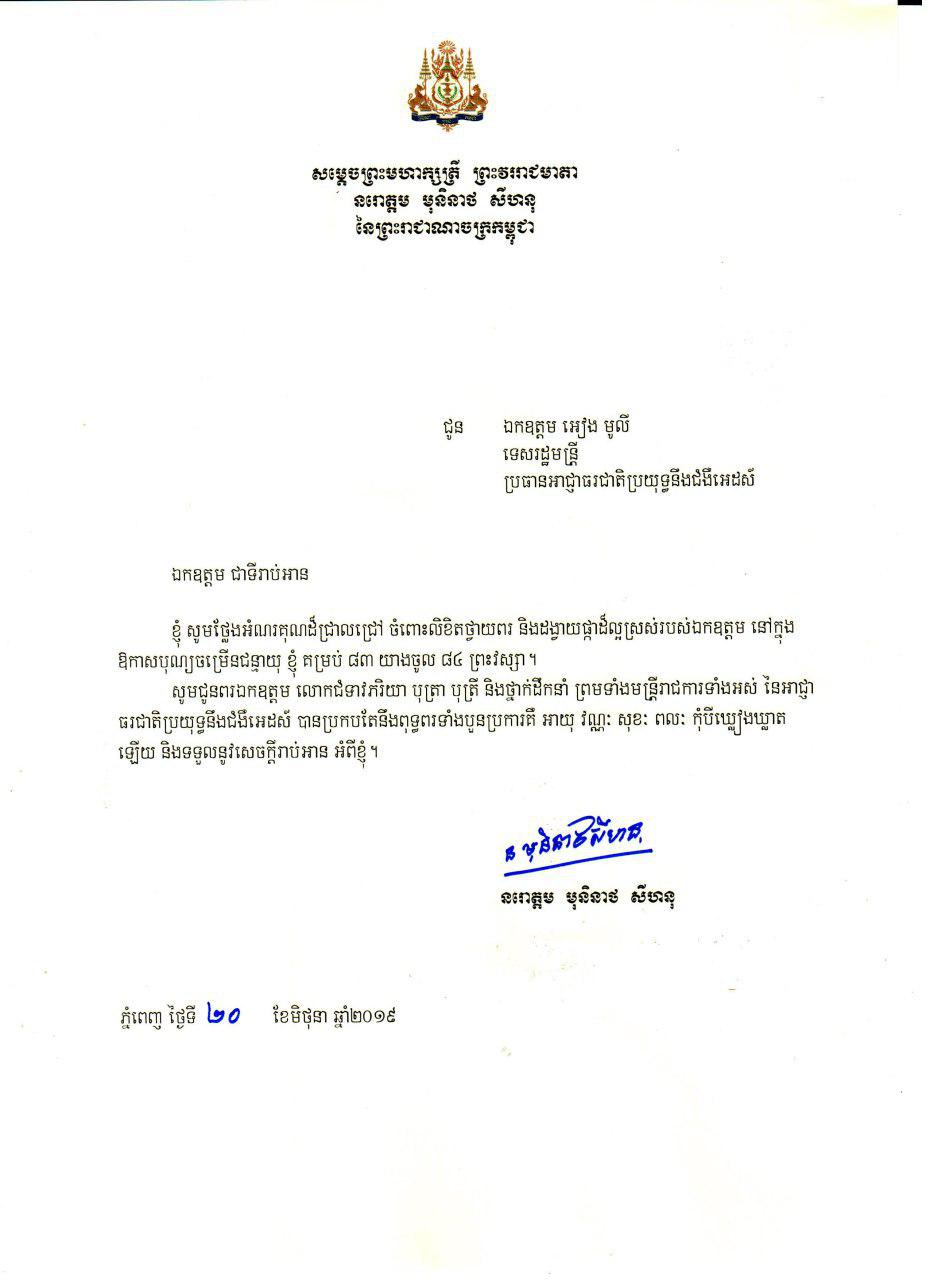 ព្រះរាជសារព្រះករុណាព្រះបាទព្រះបុរមនាថ ព្រះមហាក្សត្រ នៃព្រះរាជាណាចក្រកម្ពុជា ជូន ឯកឧត្តមទេសរដ្ឋមន្ត្រី អៀង មូលី