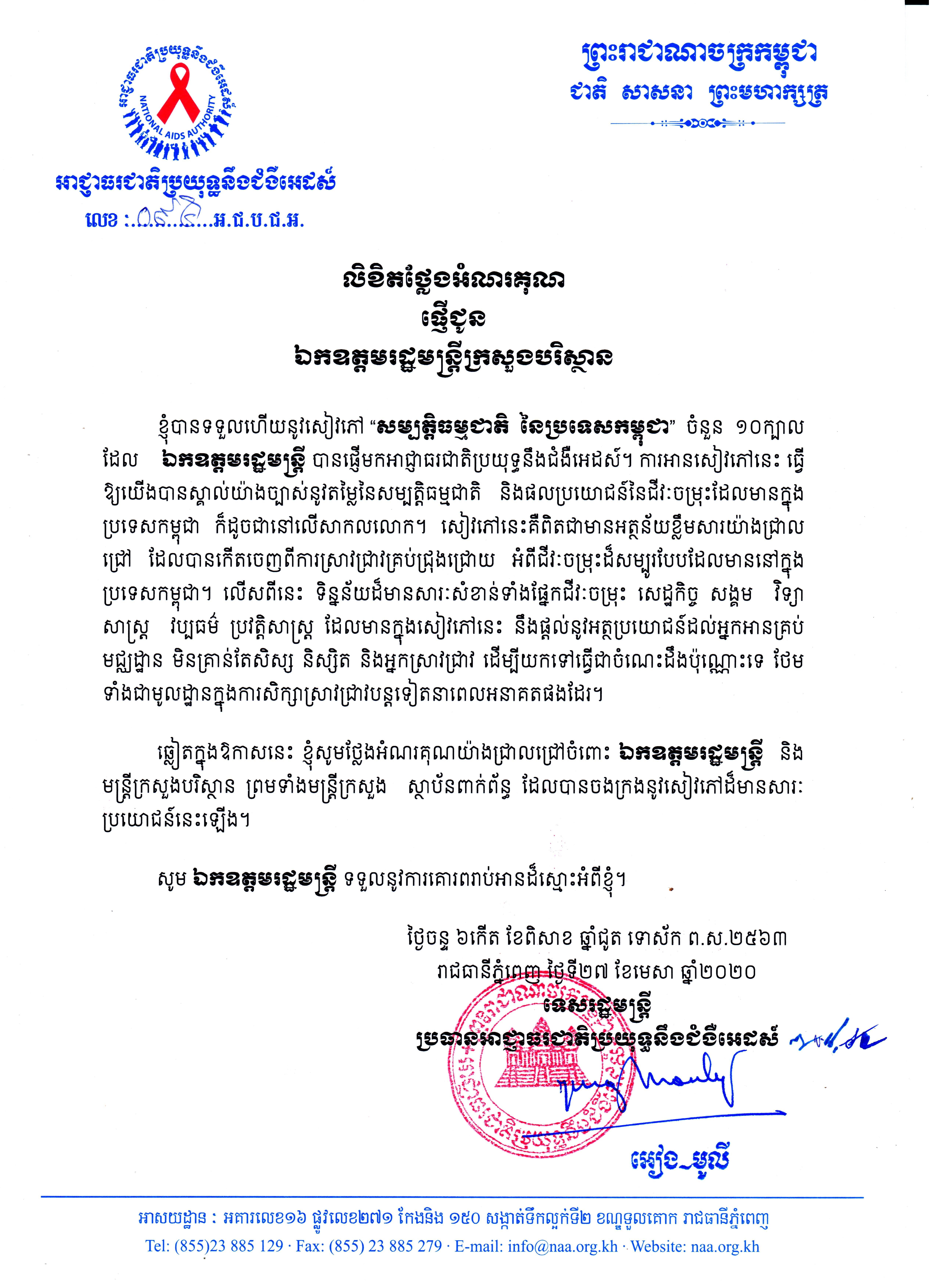 លិខិតថ្លែងអំណរគុណផ្ញើជូនឯកឧត្តមរដ្ឋមន្ត្រីក្រសួងបរិស្ថាន