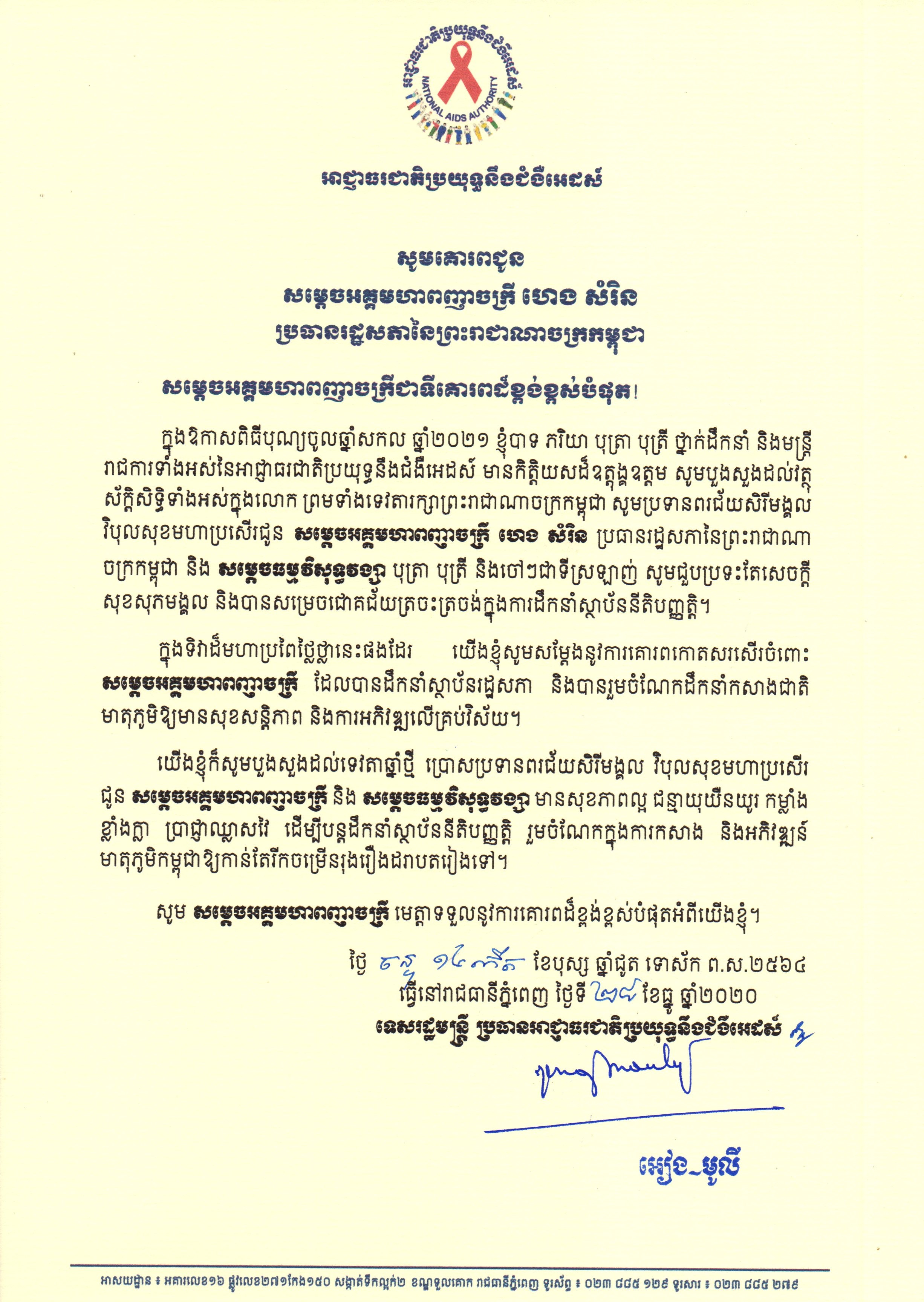 សារលិខិតជូនពរ សម្ដេចអគ្គមហាពញាចក្រី ហេង សំរិន ប្រធានរដ្ឋសភានៃព្រះរាជាណាចក្រកម្ពុជា និងសម្ដេចធម្មវិសុទ្ធវង្ស សៅ ទី ហេង សំរិន ក្នុងឱកាសចូលឆ្នាំថ្មីឆ្នាំសកល ២០២១