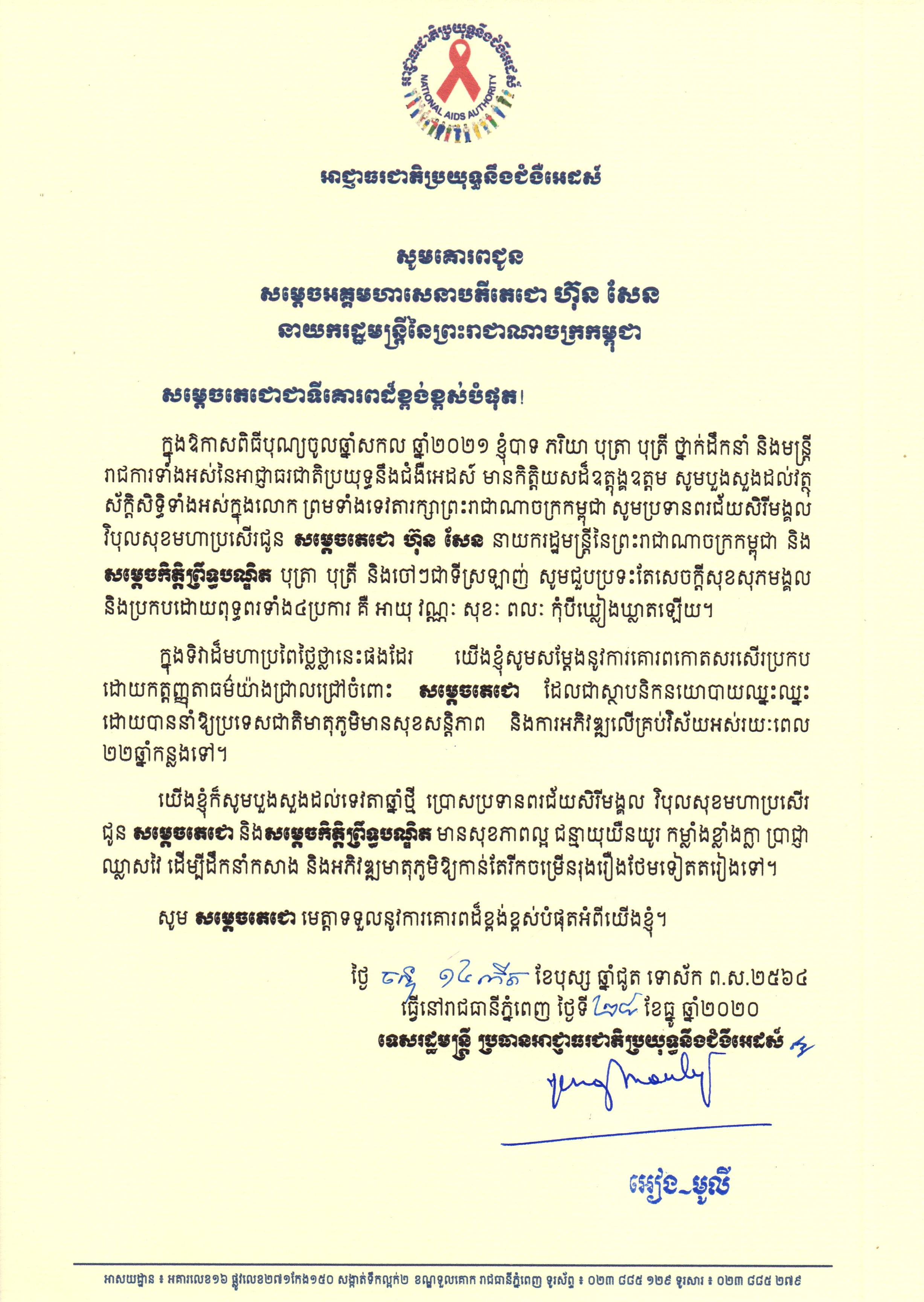 សារលិខិតជូនពរសម្ដេចអគ្គមហាសេនាបតីតេជោ ហ៊ុន សែន នាយករដ្ឋមន្រ្តី នៃព្រះរាជាណាចក្រកម្ពុជា និងសម្ដេចកិត្តិព្រឹទ្ធបណ្ឌិត ប៊ុនរ៉ានី ហ៊ុនសែន ប្រធានកាកបាទក្រហមកម្ពុជា ក្នុងឱកាសចូលឆ្នាំថ្មីឆ្នាំសកល ២០២១