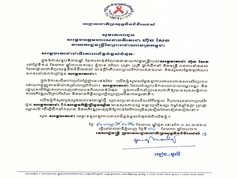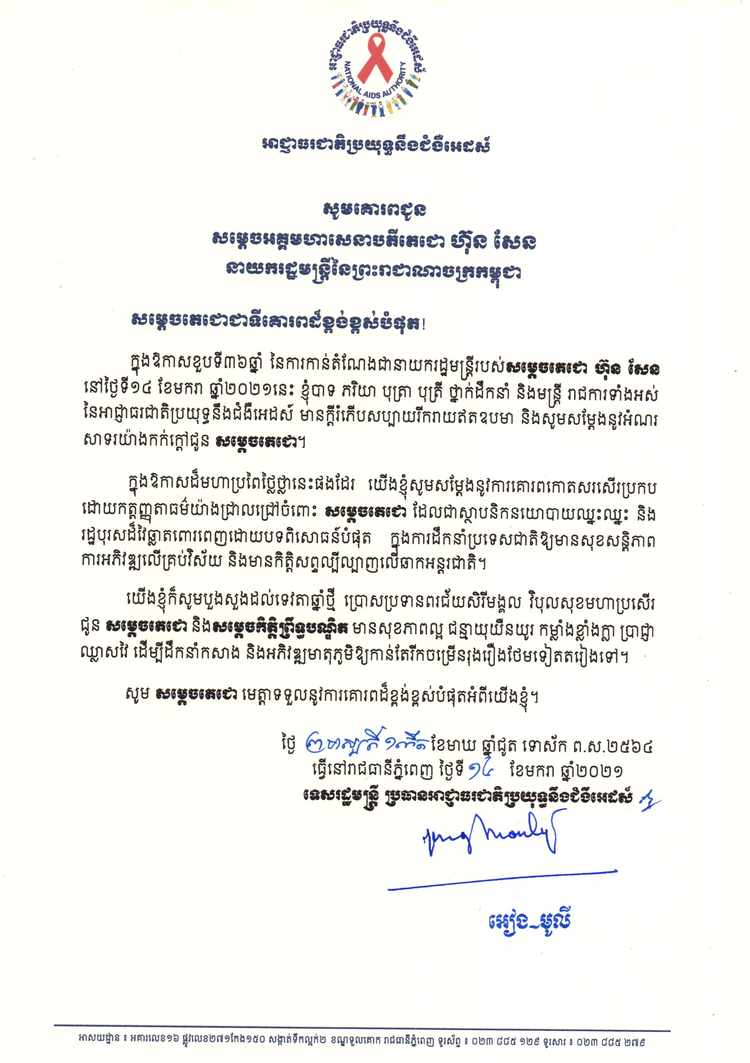 ឯកឧត្តមទេសរដ្ឋមន្ត្រី អៀង មូលី ប្រធានអាជ្ញាធរជាតិប្រយុទ្ធនឹងជំងឺអេដស៍ ផ្ញើសារលិខិតអបអរសាទរ និងជូនពរ សម្តេចតេជោ ហ៊ុន សែន ក្នុងឱកាសខួប៣៦ឆ្នាំ នៃការចូលកាន់តំណែងជានាយករដ្ឋមន្ត្រីនៃព្រះរាជាណាចក្រកម្ពុជា