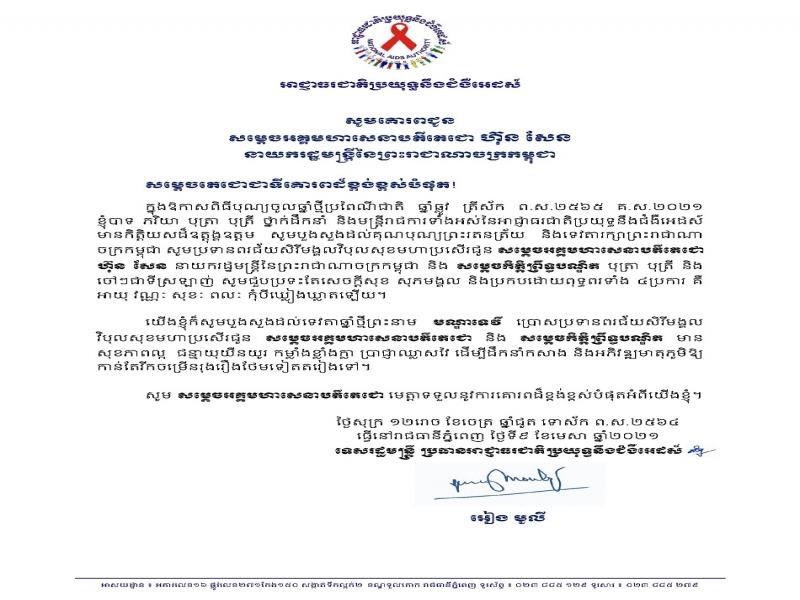 សារលិខិតជូនពរសម្ដេចអគ្គមហាសេនាបតីតេជោ ហ៊ុន សែន នាយករដ្ឋមន្រ្តី នៃព្រះរាជាណាចក្រកម្ពុជា និងសម្ដេចកិត្តិព្រឹទ្ធបណ្ឌិត ប៊ុនរ៉ានី ហ៊ុនសែន ប្រធានកាកបាទក្រហមកម្ពុជា ក្នុងឱកាសពិធីបុណ្យចូលឆ្នាំថ្មីប្រពៃណីជាតិ ឆ្នាំឆ្លូវ ត្រីស័ក ព.ស.២៥៦៥ គ.ស.២០២១
