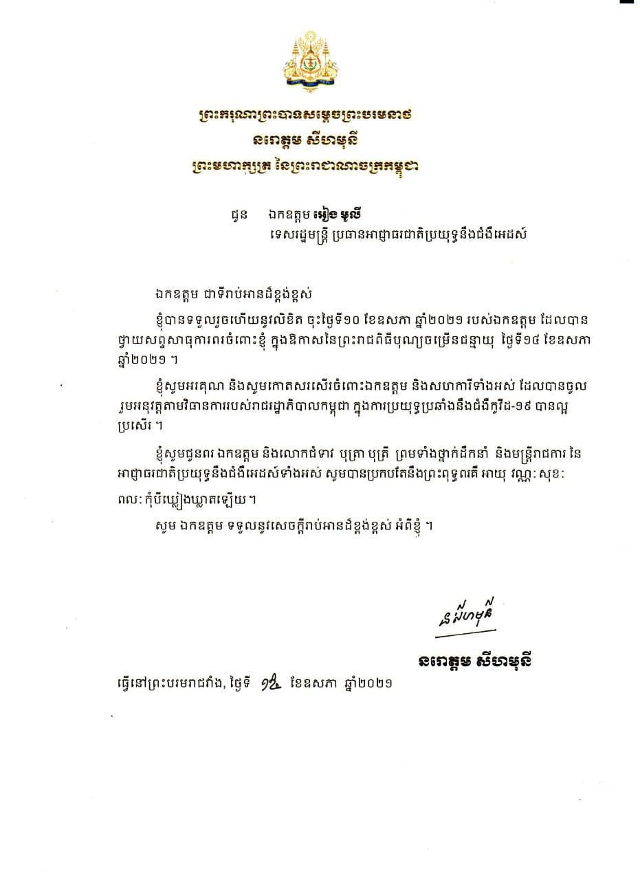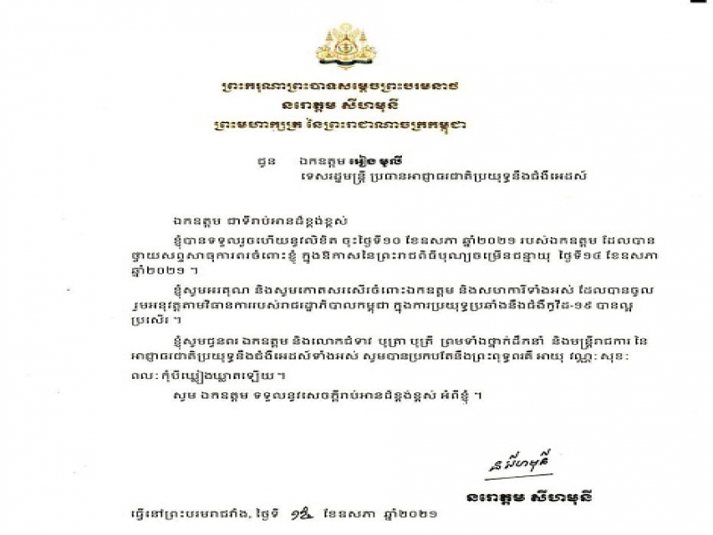 សារលិខិតថ្លែងអំណរគុណ ព្រះករុណាព្រះបាទសម្តេចព្រះបរមនាថ នរោត្តម សីហមុនី ព្រះមហាក្សត្រ នៃព្រះរាជាណាចក្រម្ពុជា ជូនចំពោះ ឯកឧត្តមទេសរដ្ឋមន្ត្រី អៀង មូលី ប្រធានអាជ្ញាធរជាតិប្រយុទ្ធនឹងជំងឺអេដស៍