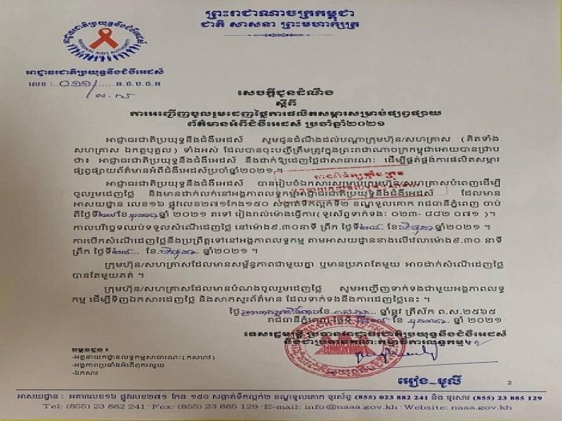 សេចក្តីជូនដំណឹង ស្តីពីការអញ្ជើញចូលរួមដេញថ្លៃ ការផលិតសម្ភារសម្រាប់ផ្សព្វផ្សាយព័ត៌មានអំពីជំងឺអេដស៍ ប្រចាំឆ្នាំ២០២១