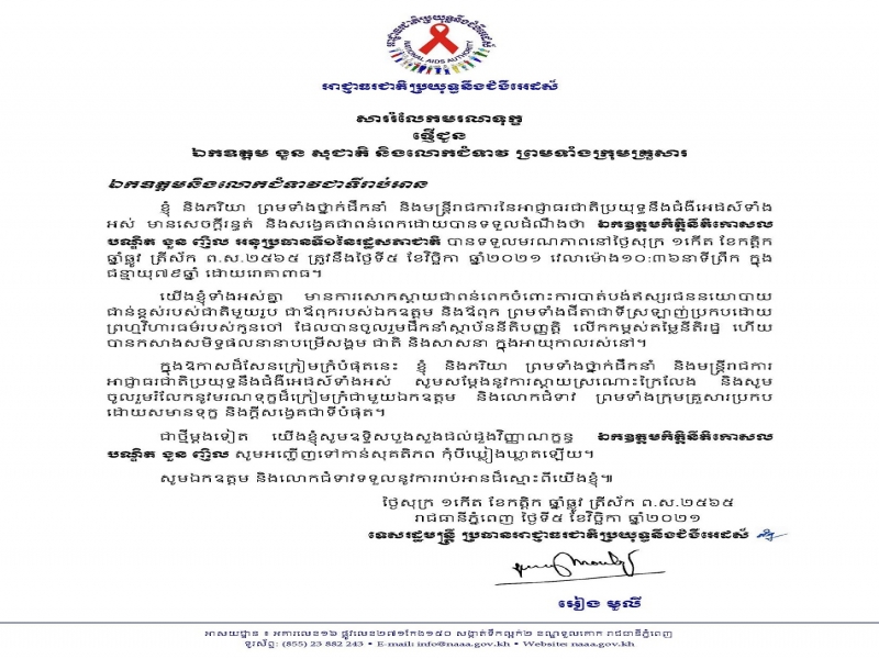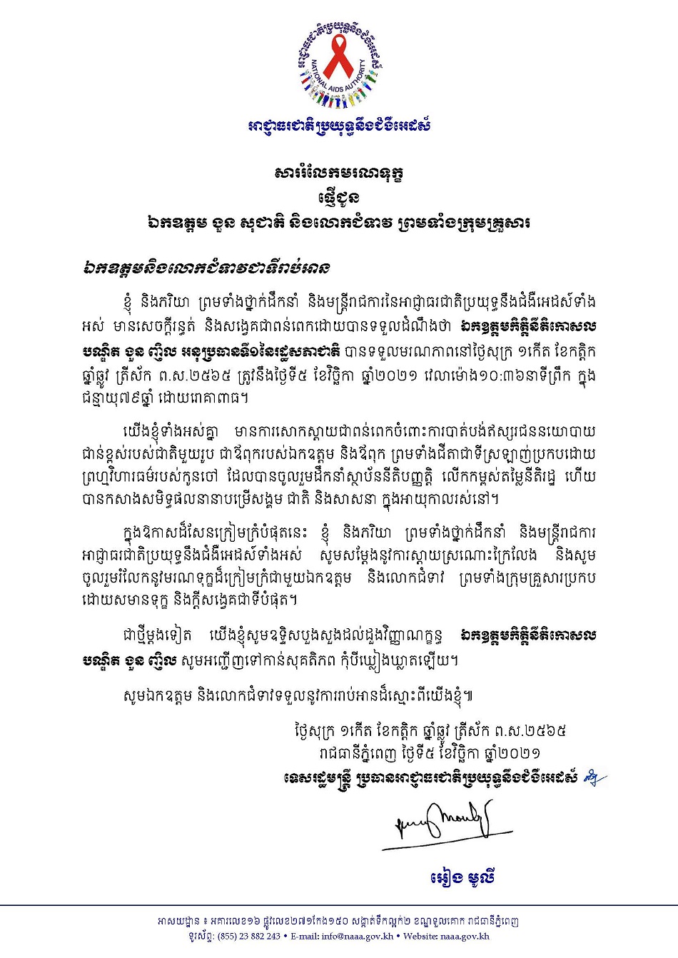 សាររំលែកមរណទុក្ខផ្ញើជូន ឯកឧត្តម ងួន សុជាតិ និងលោកជំទាវ ព្រមទាំងក្រុមគ្រួសារ