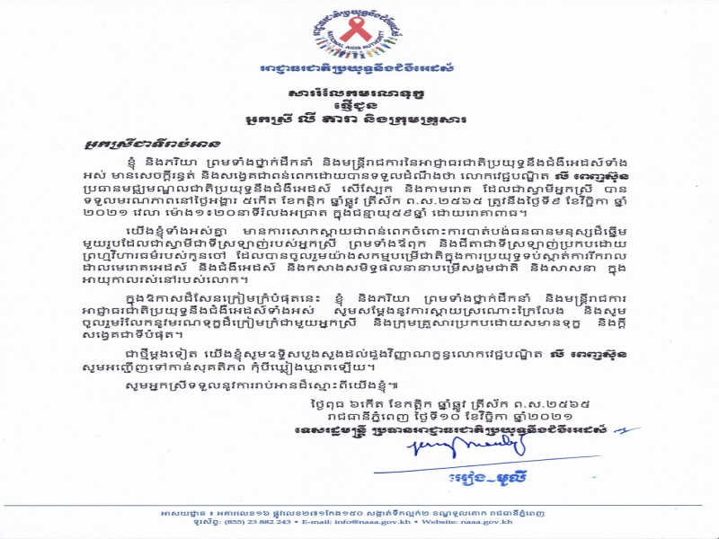 សាររំលែកមរណទុក្ខផ្ញើជូន អ្នកស្រី លី តារា និងក្រុមគ្រួសារ