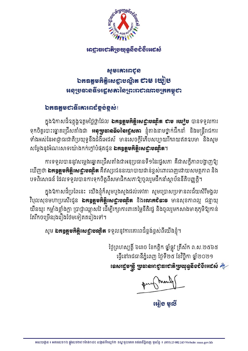 លិខិតអបអរសាទរគោរពជូន ឯកឧត្តមកិតិសេដ្ឋាបណ្ឌិត ជាម យៀប បានទទួលការទុកចិត្តបោះឆ្នោតជ្រើសតាំងជា អនុប្រធានទី១នៃរដ្ឋសភា នៃព្រះរាជាណាចក្រកម្ពុជា
