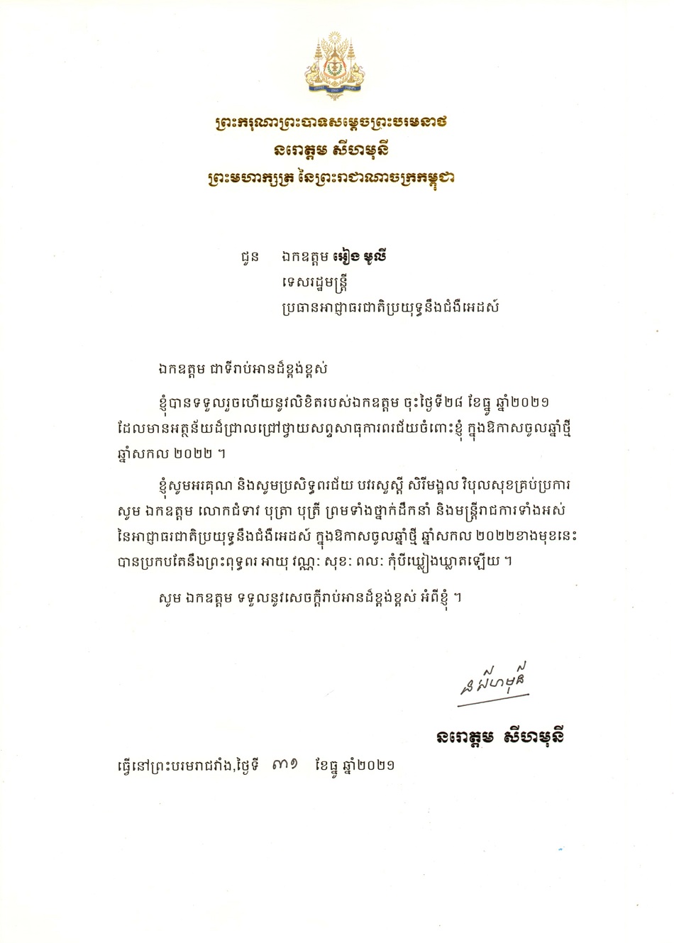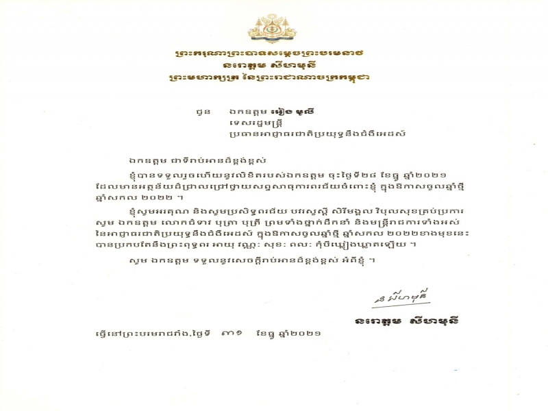សារលិខិតឆ្លើយតបរបស់ព្រះមហាក្សត្រចំពោះការថ្វាយព្រះពរចូលឆ្នាំសកល ២០២២ ជូនឯកឧត្តមទេសរដ្ឋមន្ត្រី អៀង មូលី ប្រធានអាជ្ញាធរជាតិប្រយុទ្ធនឹងជំងឺអេដស៍