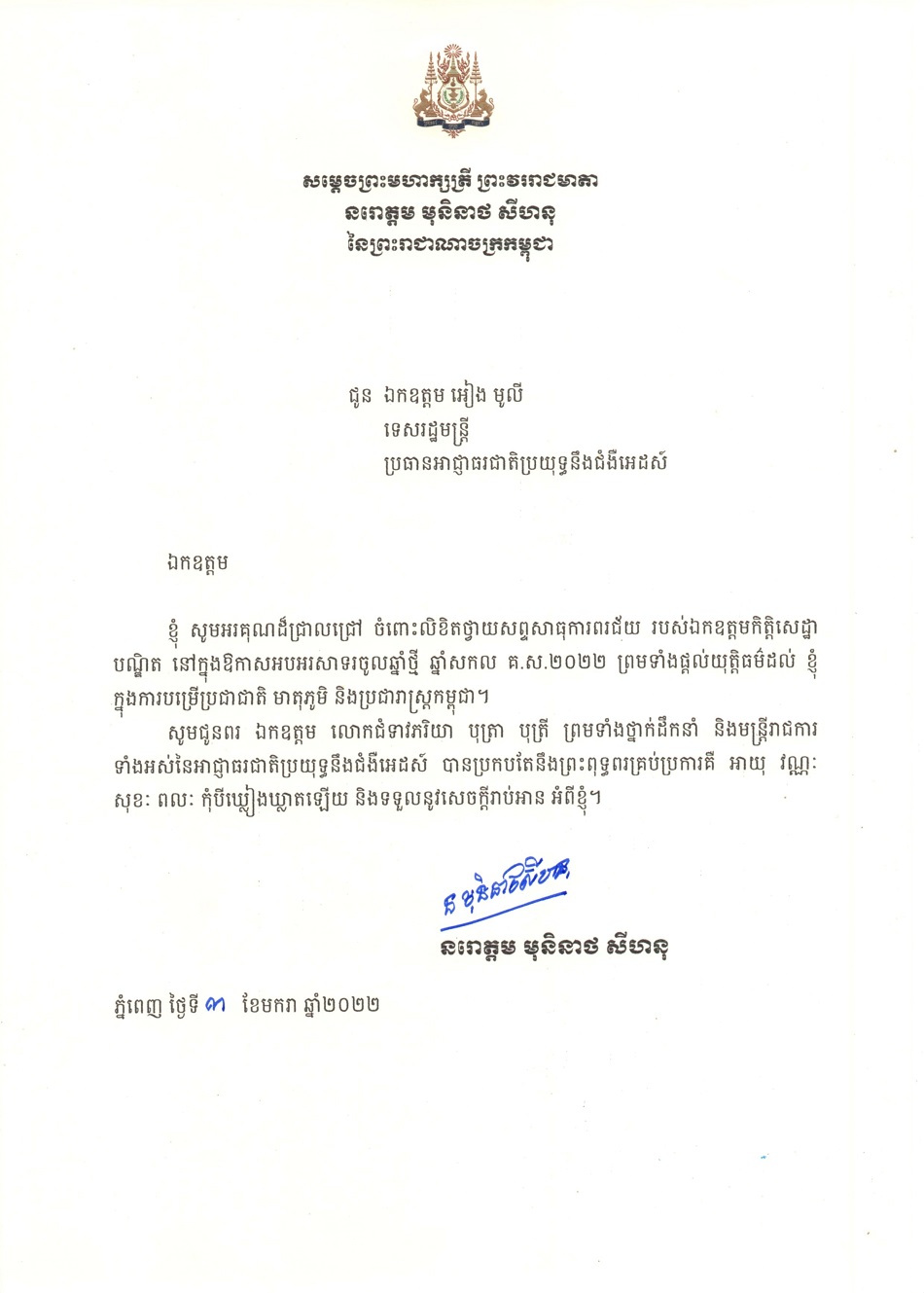 សារលិខិតឆ្លើយតបរបស់ព្រះមហាក្សត្រីវររាជមាតាចំពោះការថ្វាយព្រះពរចូលឆ្នាំសកល ២០២២ ជូនឯកឧត្តមទេសរដ្ឋមន្ត្រី អៀង មូលី ប្រធានអាជ្ញាធរជាតិប្រយុទ្ធនឹងជំងឺអេដស៍