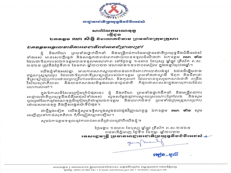 សាររំលែកមរណទុក្ខផ្ញើជូន ឯកឧត្តម ឈា សិទ្ធិ និងលោកជំទាវ ព្រមទាំងក្រុមគ្រួសារ