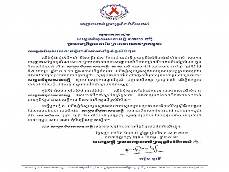 សារជូនពរ សម្តេចវិបុលសេនាភក្តី សាយ ឈុំ ប្រធានព្រឹទ្ធសភា នៃព្រះរាជាណាចក្រកម្ពុជាក្នុងឱកាសថ្ងៃខួបកំណើត គម្រប់៧៧ ឈានចូល ៧៨ឆ្នាំ ត្រូវនឹងថ្ងៃទី៥ ខែកុម្ភៈ ឆ្នាំ២០២២