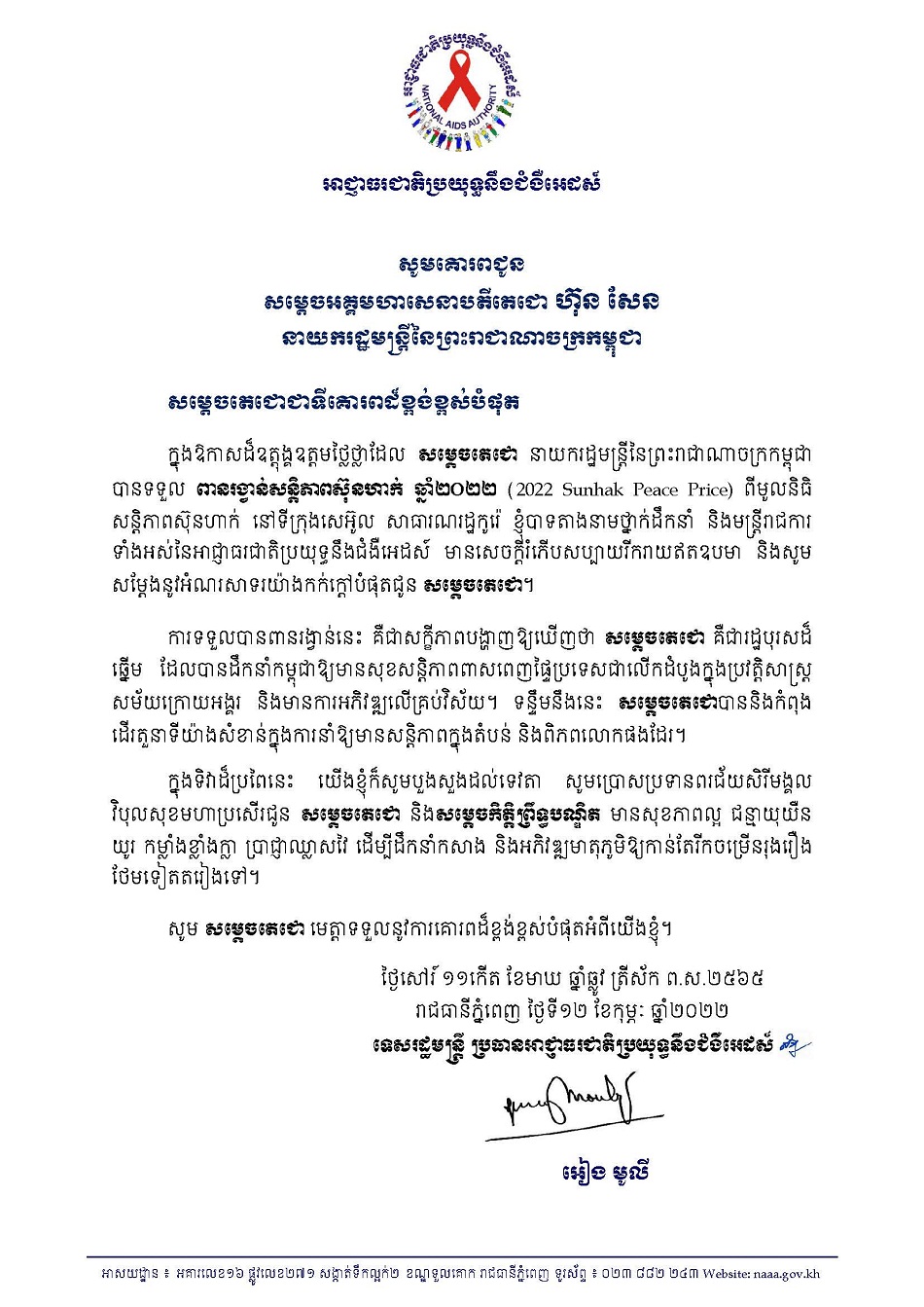 សារលិខិតអបអរសាទរសម្តេចអគ្គមហាសេនាបតីតេជោ ហ៊ុន សែន នាយករដ្ឋមន្ត្រីនៃព្រះរាជាណាចក្រកម្ពុជា បានទទួលពានរង្វាន់សន្តិភាពស៊ុនហាក់ ឆ្នាំ២០២២ (2022 Shunhak Peace Price)