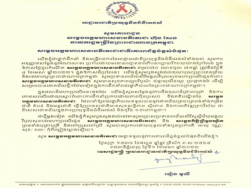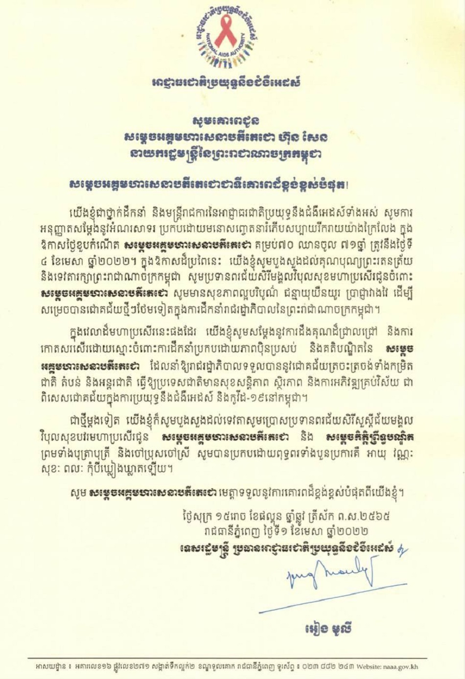 សារលិខិតជូនពរសម្ដេចអគ្គមហាសេនាបតីតេជោ ហ៊ុន សែន នាយករដ្ឋមន្រ្តីនៃព្រះរាជាណាចក្រកម្ពុជា ក្នុងឱកាសថ្ងៃខួបកំណើត គម្រប់៧០ ឈានចូល៧១ឆ្នាំ ត្រូវនឹងថ្ងៃទី៤ ខែមេសា ឆ្នាំ២០២២