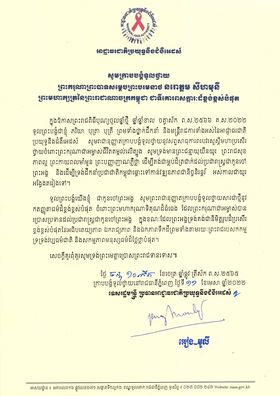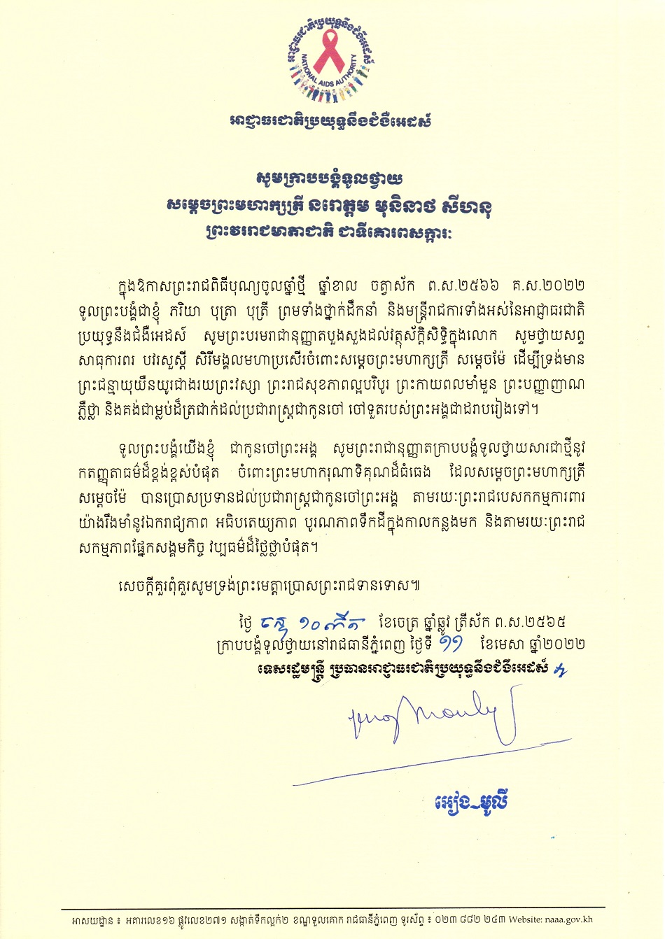សារលិខិតថ្វាយព្រះពរព្រះបាទសម្ដេចព្រះបរមនាថ នរោត្តម សីហមុនី ព្រះមហាក្សត្រនៃព្រះរាជាណាចក្រកម្ពុជា និងសម្ដេចព្រះមហាក្សត្រី នរោត្តម មុនិនាថ សីហនុ ព្រះវររាជមាតាជាតិខ្មែរ ក្នុងឱកាសពិធីបុណ្យចូលឆ្នាំថ្មីប្រពៃណីជាតិ ឆ្នាំខាល ២០២២