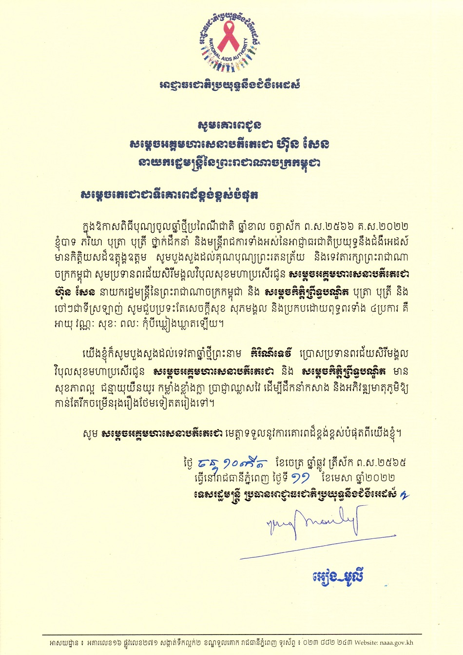 លិខិតគោរពជូនពរសម្ដេចអគ្គមហាសេនាបតីតេជោ ហ៊ុន សែន នាយករដ្ឋមន្រ្តី នៃព្រះរាជាណាចក្រកម្ពុជា និងសម្ដេចកិត្តិព្រឹទ្ធបណ្ឌិត ក្នុងឱកាសពិធីបុណ្យចូលឆ្នាំថ្មីប្រពៃណីជាតិ ឆ្នាំខាល ២០២២