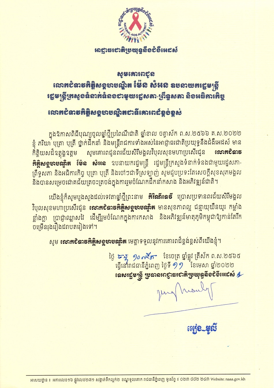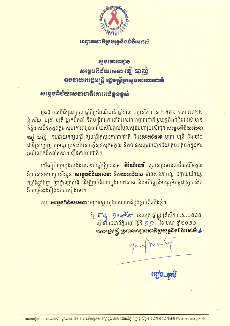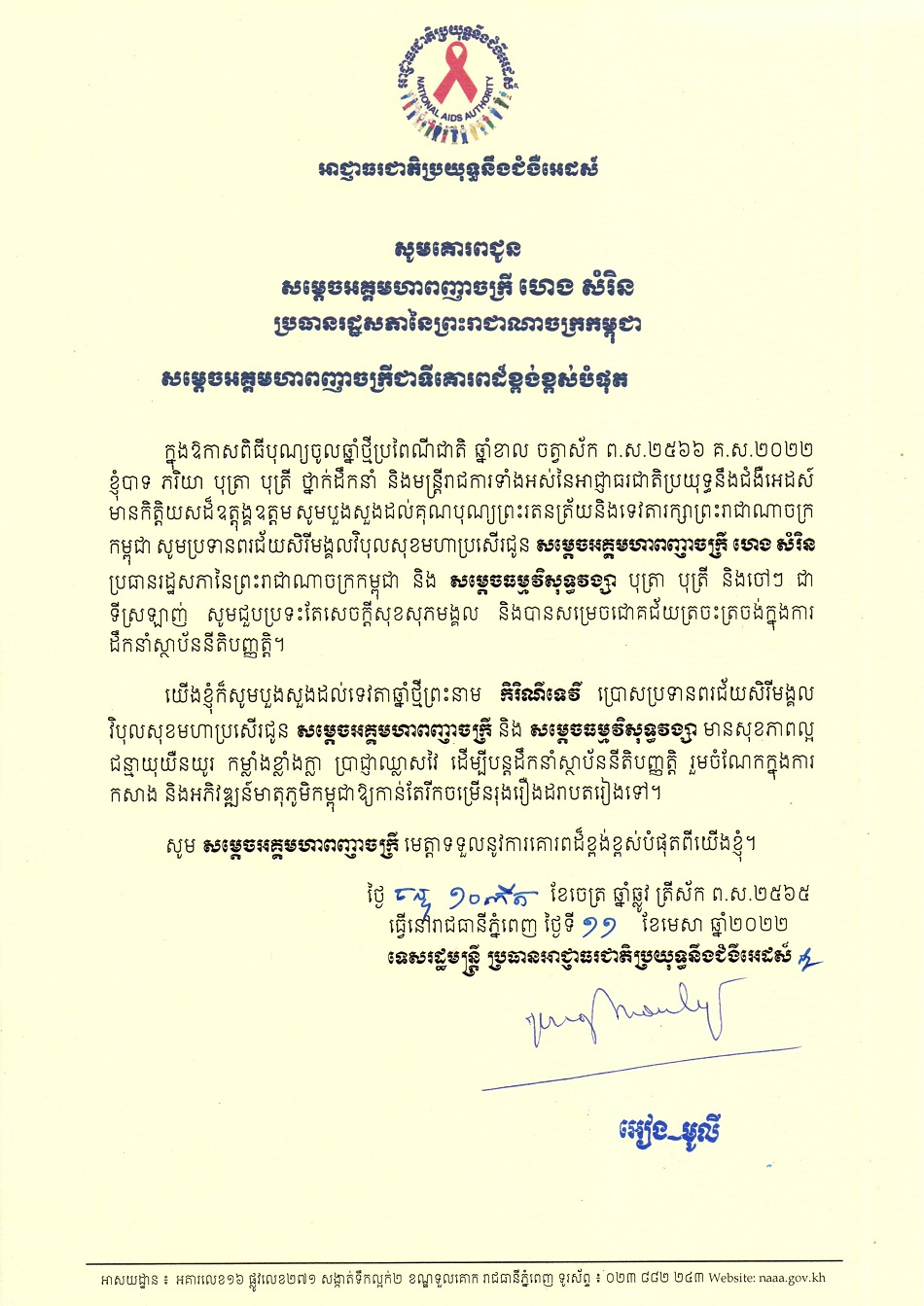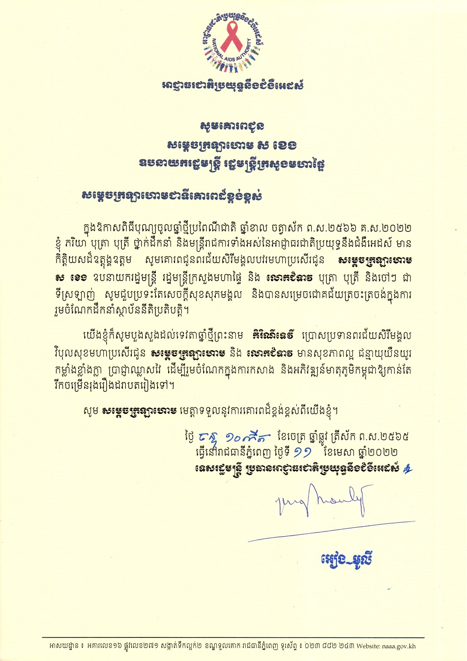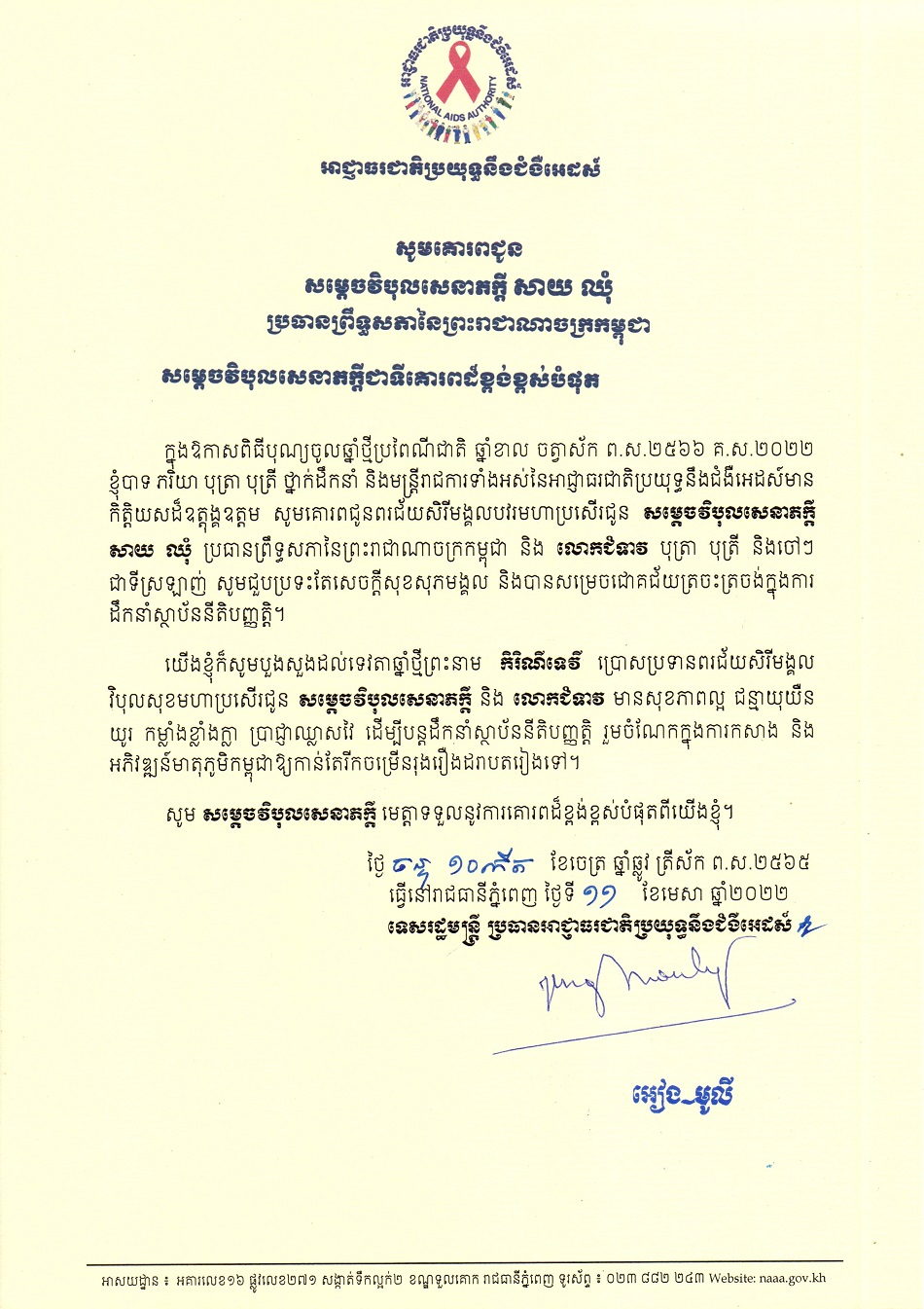 លិខិតគោរពជូនពរ ថ្នាក់ដឹកនាំកំពូល នៃព្រះរាជាណាចក្រកម្ពុជា ក្នុងឱកាសពិធីបុណ្យចូលឆ្នាំថ្មីប្រពៃណីជាតិ ឆ្នាំខាល ២០២២