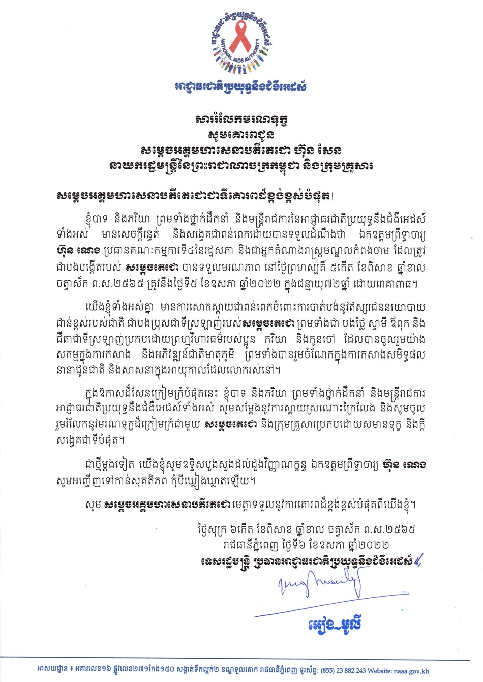 សាររំលែកមរណទុក្ខគោរពជូន សម្ដេចអគ្គមហាសេនាបតីតេជោ ហ៊ុន សែន នាយករដ្ឋមន្រ្តី នៃព្រះរាជាណាចក្រកម្ពុជា និងក្រុមគ្រួសារ