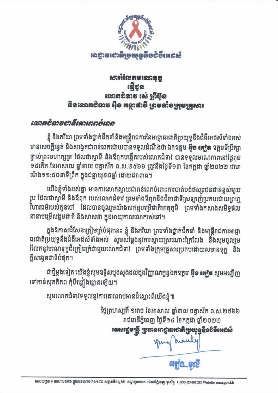 សាររំលែកមរណទុក្ខ ផ្ញើជូនលោកជំទាវ រស់ ព្រីប៊ូន និងលោកជំទាវ អុឹង កន្ថាផាវី ព្រមទាំងក្រុមគ្រួសារ