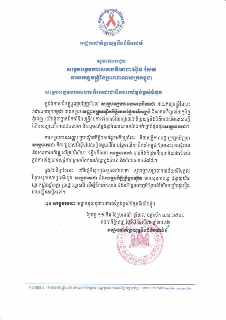 សារលិខិតអបអរសាទរសម្តេចអគ្គមហាសេនាបតីតេជោ ហ៊ុន សែន នាយករដ្ឋមន្ត្រីនៃព្រះរាជាណាចក្រកម្ពុជា បានទទួលសញ្ញាបត្របណ្ឌិតកិត្តិយសផ្នែកអភិវឌ្ឍន៍ ពីសាកលវិទ្យាល័យភូមិន្ទភ្នំពេញ