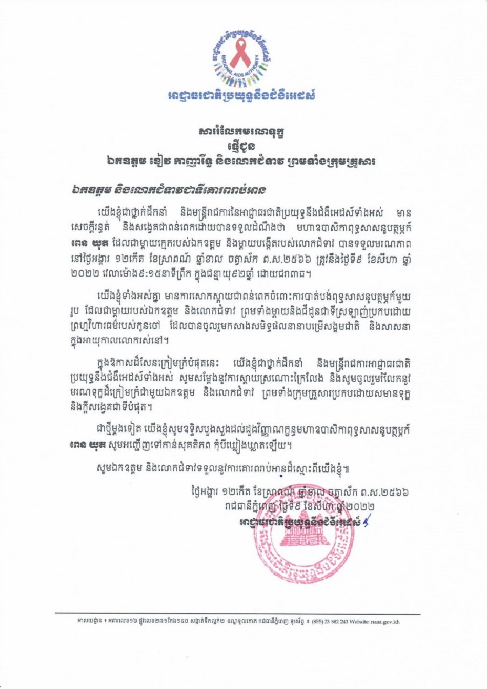 សាររំលែកមរណទុក្ខផ្ញើជូន ឯកឧត្តម ខៀវ កាញារីទ្ធ និងលោកជំទាវ ព្រមទាំងក្រុមគ្រួសារ