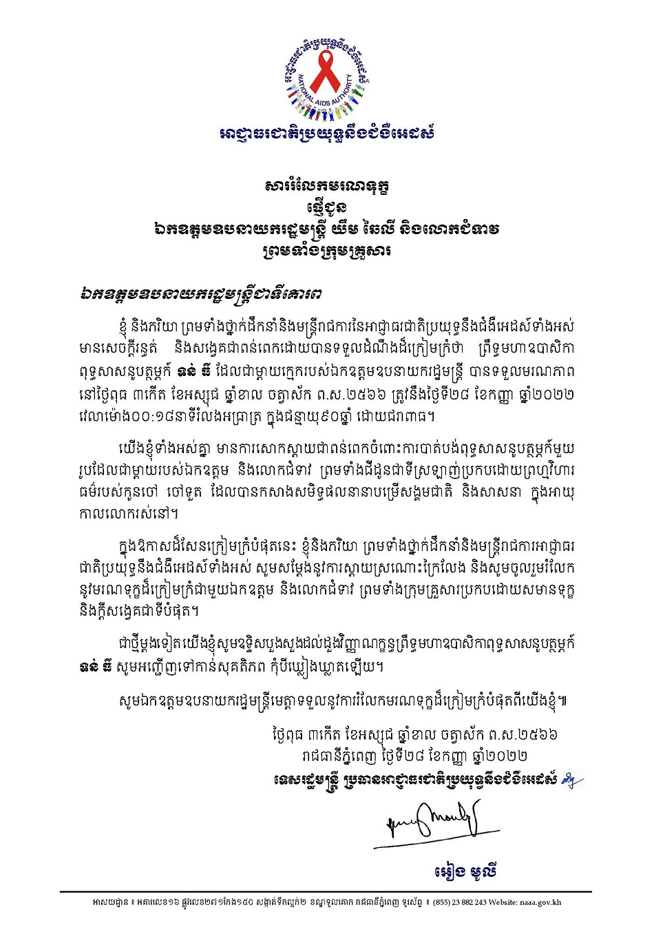 សាររំលែកមរណទុក្ខ ផ្ញើជូនឯកឧត្តមឧបនាយករដ្ឋមន្ត្រី យឹម ឆៃលី និងលោកជំទាវ ព្រមទាំងក្រុមគ្រួសារ