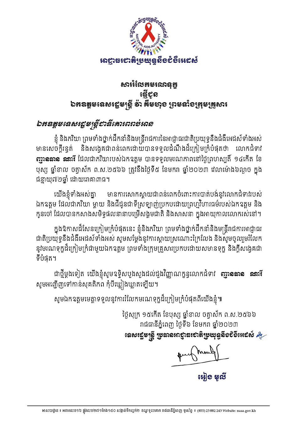 សាររំលែកមរណទុក្ខ ផ្ញើជូនឯកឧត្តមទេសរដ្ឋមន្ត្រី វ៉ា គឹមហុង ព្រមទាំងក្រុមគ្រួសារ