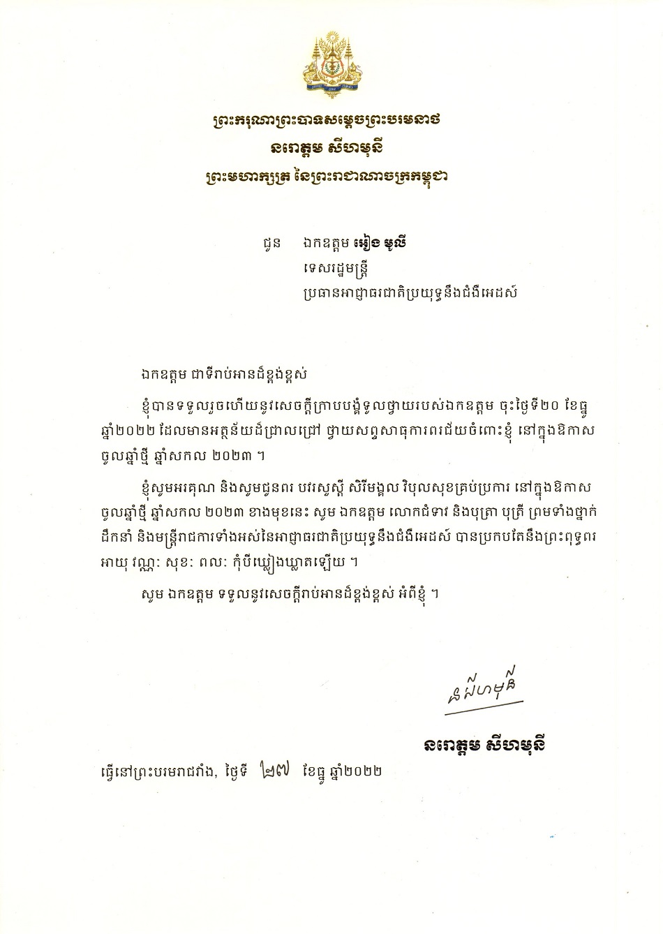 សារលិខិតឆ្លើយតបរបស់ព្រះមហាក្សត្រចំពោះការថ្វាយព្រះពរ ក្នុងឱកាសពិធីបុណ្យចូលឆ្នាំសកល ឆ្នាំ២០២៣ ជូនឯកឧត្តមទេសរដ្ឋមន្ត្រី អៀង មូលី ប្រធានអាជ្ញាធរជាតិប្រយុទ្ធនឹងជំងឺអេដស៍