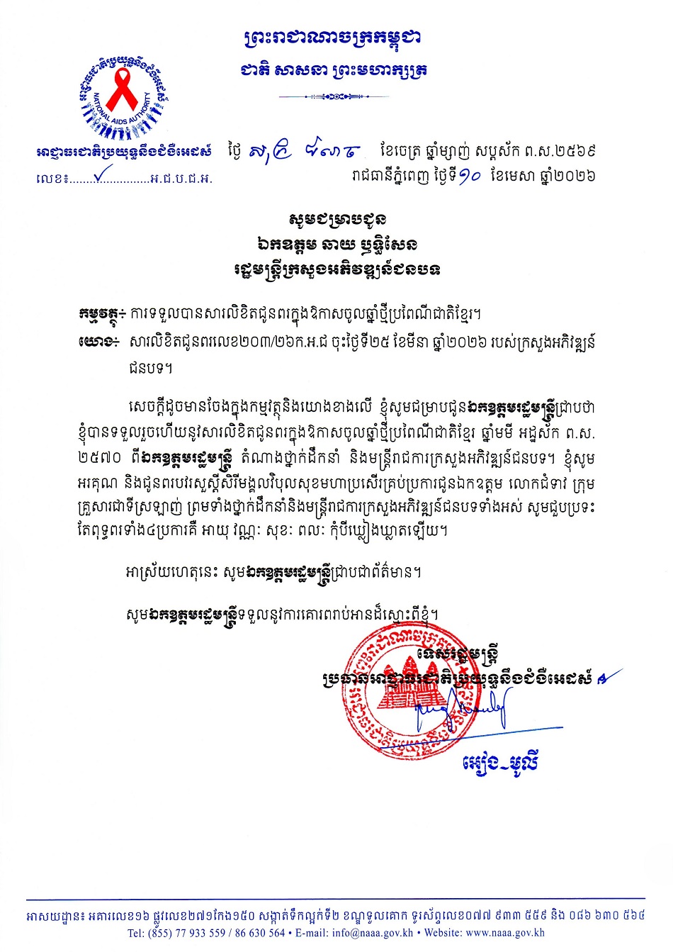 ក្រសួងអភិវឌ្ឍន៍ជនបទ ផ្ញើសារលិខិតជូនពរ ឯកឧត្តមទេសរដ្ឋមន្ត្រី អៀង មូលី ប្រធានអាជ្ញាធរជាតិប្រយុទ្ធនឹងជំងឺអេដស៍ ក្នុងឱកាសពិធីបុណ្យចូលឆ្នាំថ្មី ប្រពៃណីជាតិខ្មែរ