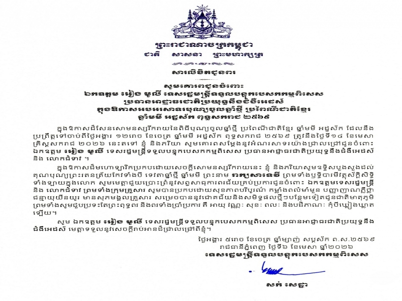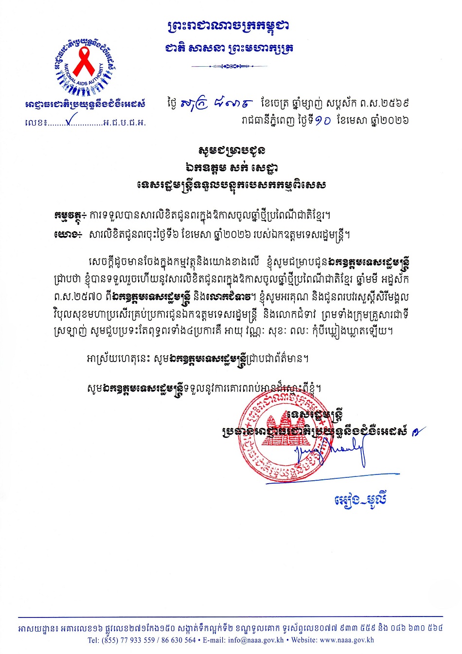 ឯកឧត្តម សក់ សេដ្ឋា ទេសរដ្ឋមន្ត្រីទទួលបន្ទុកបេសកកម្មពិសេស ផ្ញើសារលិខិតជូនពរ ឯកឧត្តមទេសរដ្ឋមន្ត្រី អៀង មូលី ប្រធានអាជ្ញាធរជាតិប្រយុទ្ធនឹងជំងឺអេដស៍ ក្នុងឱកាសពិធីបុណ្យចូលឆ្នាំថ្មី ប្រពៃណីជាតិខ្មែរ