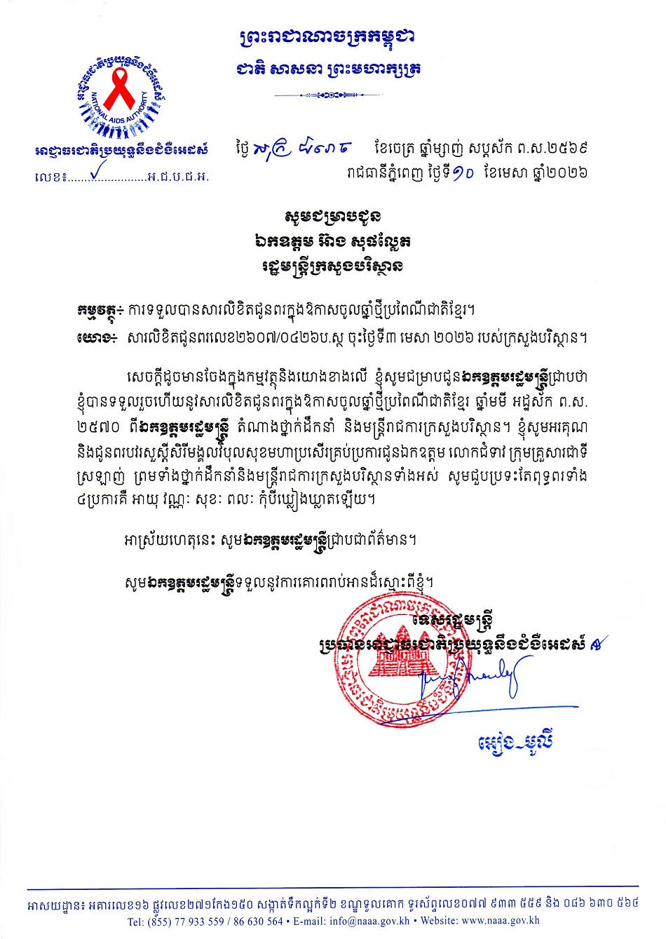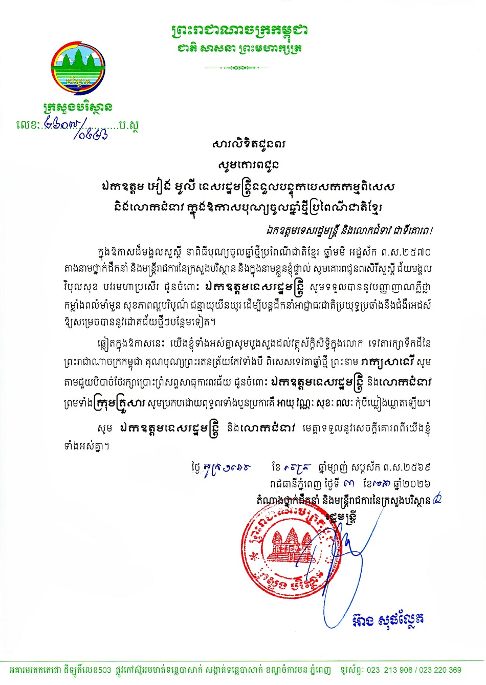 ក្រសួងបរិស្ថាន ផ្ញើសារលិខិតជូនពរ ឯកឧត្តមទេសរដ្ឋមន្ត្រី អៀង មូលី ប្រធានអាជ្ញាធរជាតិប្រយុទ្ធនឹងជំងឺអេដស៍ ក្នុងឱកាសពិធីបុណ្យចូលឆ្នាំថ្មី ប្រពៃណីជាតិខ្មែរ