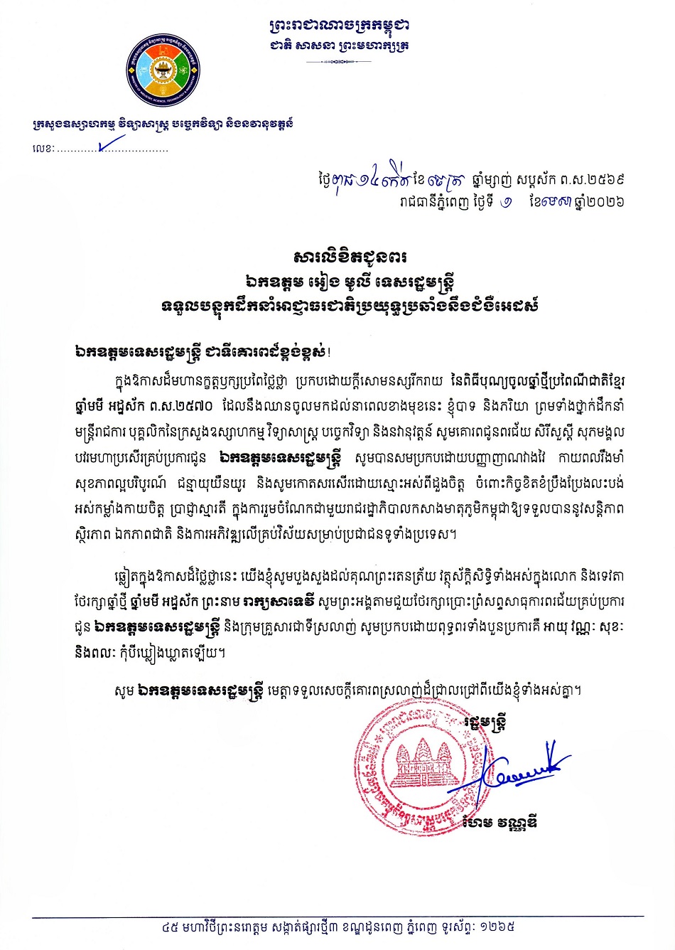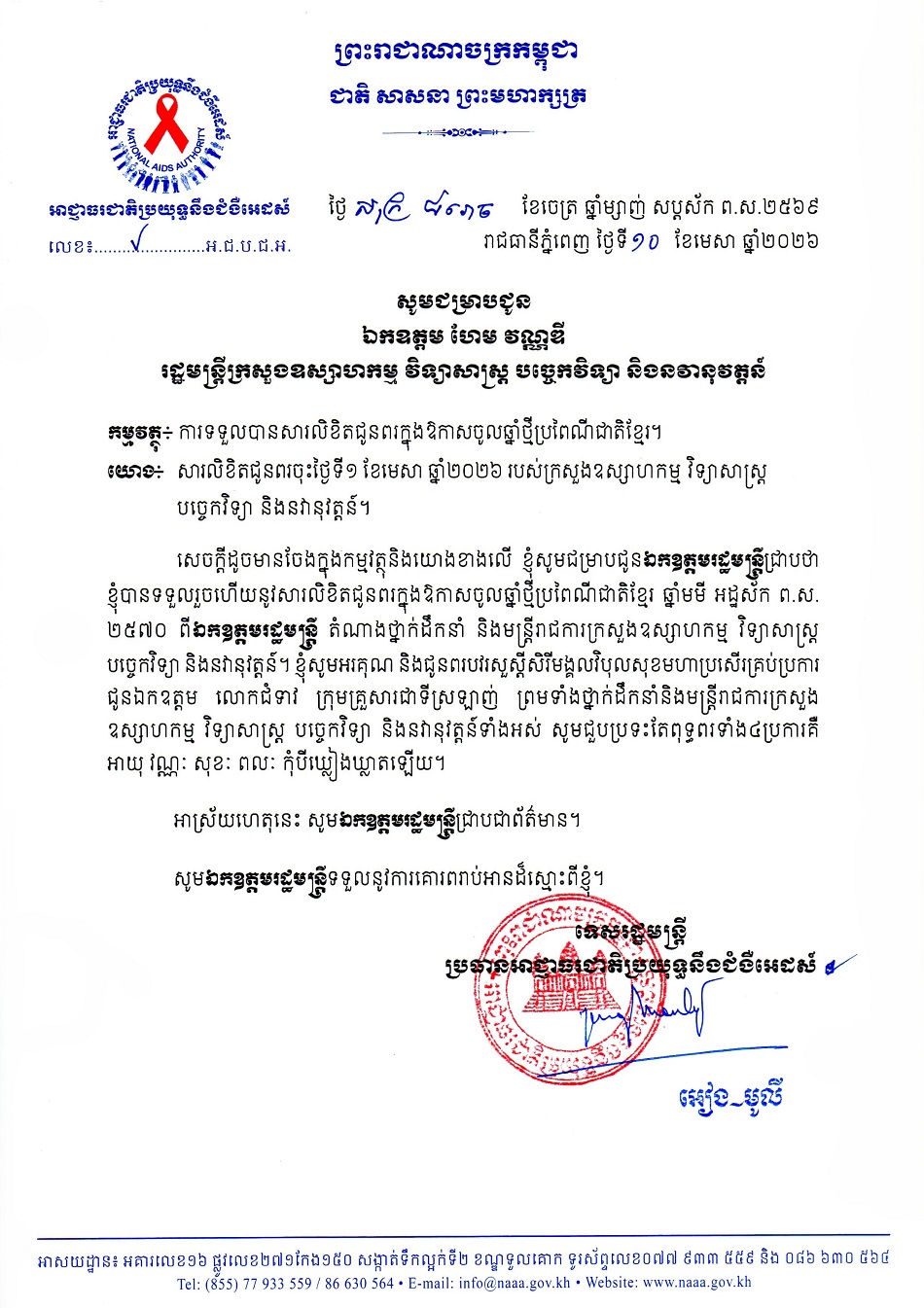 ក្រសួងឧស្សាហកម្ម វិទ្យាសាស្ត្រ បច្ចេកវិទ្យា និងនវានុវត្តន៍ ផ្ញើសារលិខិតជូនពរ ឯកឧត្តមទេសរដ្ឋមន្ត្រី អៀង មូលី ប្រធានអាជ្ញាធរជាតិប្រយុទ្ធនឹងជំងឺអេដស៍ ក្នុងឱកាសពិធីបុណ្យចូលឆ្នាំថ្មី ប្រពៃណីជាតិខ្មែរ