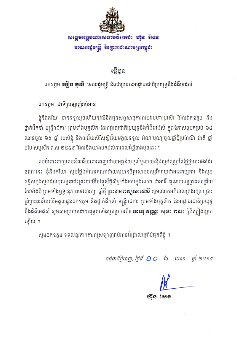 ខាងក្រោមនេះគឺជា លិខិតថ្លែងអំណរគុណរបស់ សម្តេចអគ្គមហាសេនាបតីតេជោ ហ៊ុន សែន នាយករដ្ឋមន្ត្រីនៃព្រះរាជាណាចក្រកម្ពុជា ជូនចំពោះ ឯកឧត្តមទេសរដ្ឋមន្ត្រី អៀង មូលី ប្រធានអាជ្ញាធរជាតិប្រយុទ្ធនឹងជំងឺអេដស៍៖
