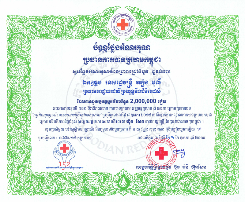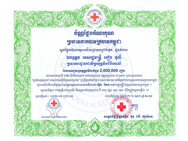 ខាងក្រោមនេះគឺជា ប័ណ្ណថ្លែងអំណរគុណរបស់កាកបាទក្រហមកម្ពុជា ជូនចំពោះឯកឧត្តមទេសរដ្ឋមន្ត្រី អៀង មូលី ប្រធានអាជ្ញាធរជាតិប្រយុទ្ធនឹងជំងឺអេដស៍៖