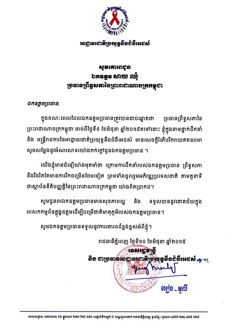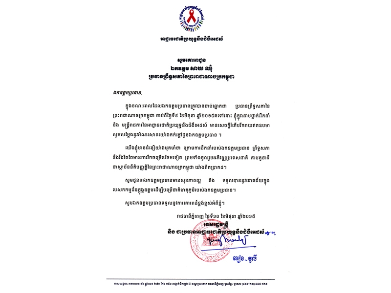 ខាងក្រោមនេះគឺជាសារលិខិតរបស់អាជ្ញាធរជាតិប្រយុទ្ធនឹងជំងឺអេដស៍ ជូនចំពោះ ឯកឧត្តម សាយ ឈុំ ដែលត្រូវជាប់ឆ្នោតជាប្រធានព្រឹទ្ធសភានៃព្រះរាជាណាចក្រកម្ពុជា៖