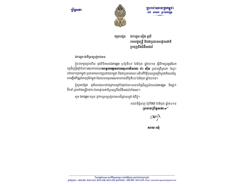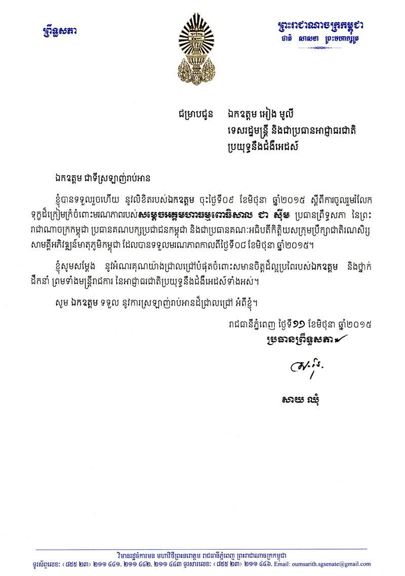 ខាងក្រោមនេះគឺជាសារលិខិតថ្លែងអំណរគុណរបស់ ឯកឧត្តម សាយ ឈុំ ប្រធានព្រឹទ្ធសភា ជូនចំពោះ ឯកឧត្តមទេសរដ្ឋមន្ត្រី អៀង មូលី ប្រធានអាជ្ញាធរជាតិប្រយុទ្ធនឹងជំងឺអេដស៍៖