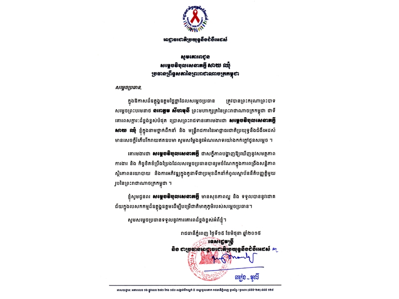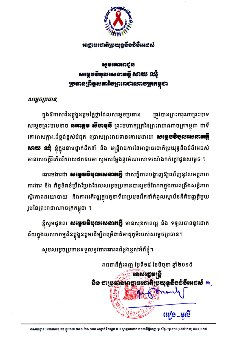 ខាងក្រោមនេះគឺជាសារលិខិតអបអរសាទររបស់អាជ្ញាធរជាតិប្រយុទ្ធនឹងជំងឺអេដស៍ ជូនចំពោះសម្តេចវិបុលសេនាភក្តី សាយ ឈុំ៖
