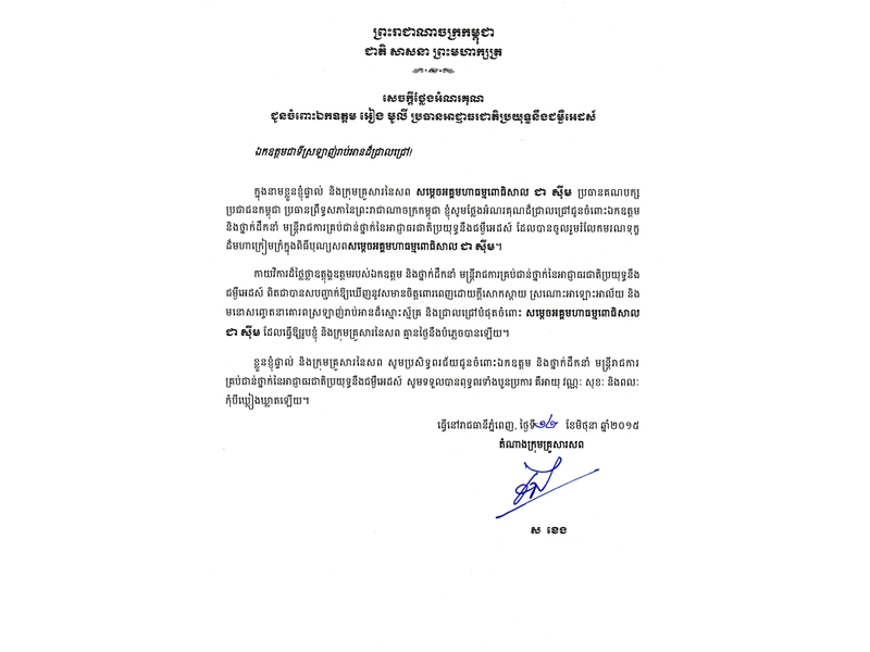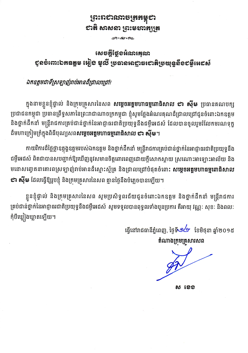 ខាងក្រោមនេះគឺជាលិខិតថ្លែងអំណរគុណរបស់សម្តេចក្រឡាហោម ស ខេង ជូនចំពោះ ឯកឧត្តមទេសរដ្ឋមន្ត្រី អៀង មូលី ប្រធានអាជ្ញាធរជាតិប្រយុទ្ធនឹងជំងឺអេដស៍៖